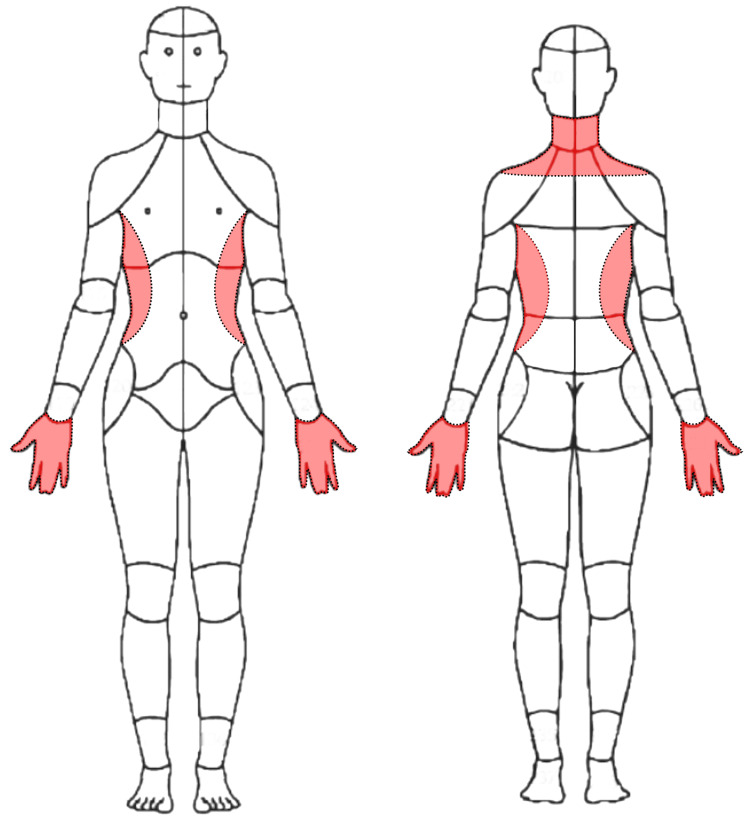Debbie, a 62–year-old female nonsmoker with a past medical history of asthma, hypertension, and bilateral carpal tunnel syndrome status post bilateral surgical decompression presented to a chiropractor in an integrative setting with a three-month exacerbation of frequent neck pain and tightness, with constant numbness and tingling in her hands diffusely and bilaterally (Figure 1). She rated her current neck pain 3/10 on the numeric rating scale with occasional severe pain at 8/10. She also noted a sensation of warmth along the lateral torso in the region inferior to the axilla extending to the iliac crest (Figure 2). The patient noted that it was hard to hold a pencil and tie her shoes, she dropped things frequently, and had difficulty performing tasks at work due to weakness of her hands. She also reported a reduction in sleep to less than six hours due to her symptoms. She denied any difficulties with walking or bowel or bladder disturbances.